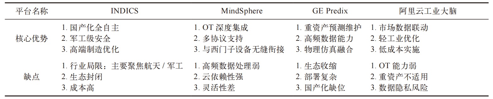 虽然目前国内外高校和研究机构针对传统的制造业正在进行智能制造升级研究,但是制造业内容庞杂,生产环境、设备、工况都千差万别。针对以上问题,在采用5G+工业互联网的基础上,依托云边协同架构对离散制造业柔性化、智能化的高度适配,尤其是其在实时控制、分布式资源管理方面的优势特点。目前垂直领域云平台主要有针对航空航天领域的INDICS平台、西门子MindSphere、通用电气开发的工业物联网平台Predix和阿里云工业大脑等平台,上述平台的特点对比见表1。