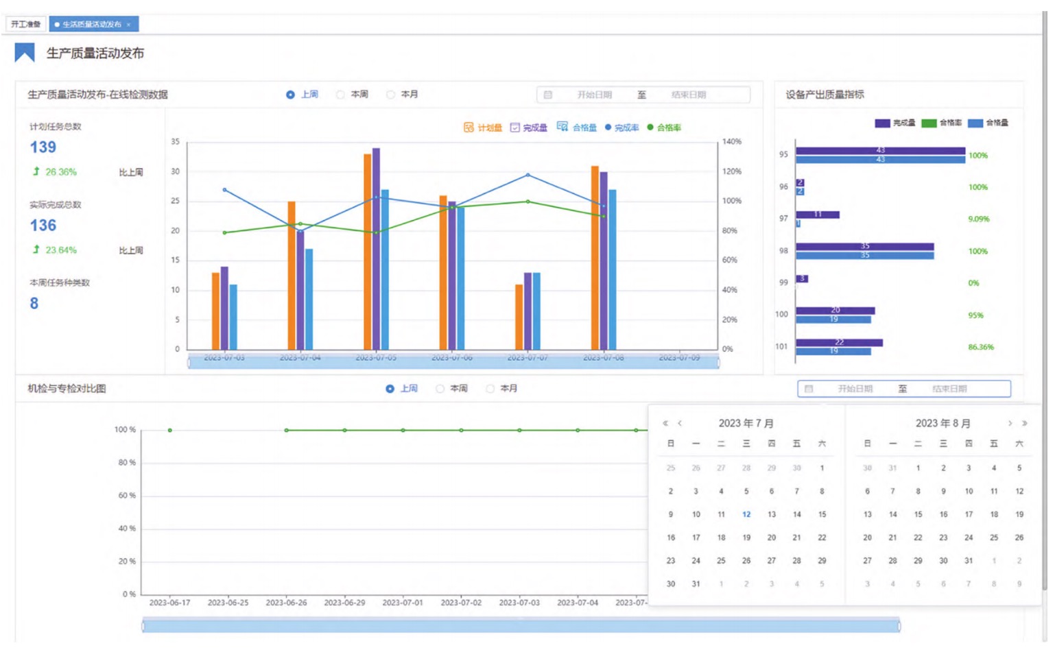 工业互联网质量管控平台使用大数据分析、数字化模拟技术,分析产品质量与产品工艺之间的关系,通过对产品质量与工艺参数映射模型的构建,得到能够提升产品质量的工艺参数。质量报表界面如图6所示。