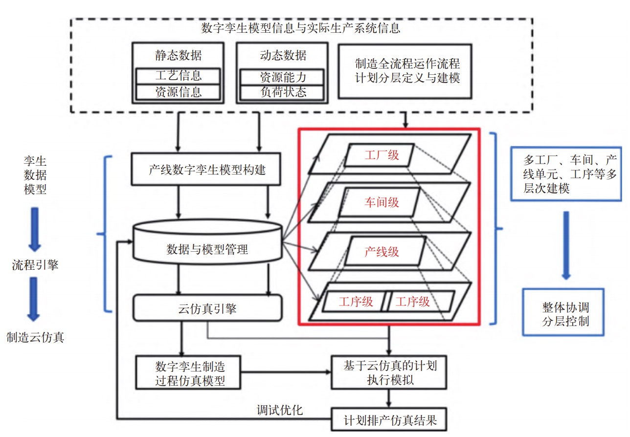 建设多层多维的数字孪生系统,包括设备运行、产线运行、工厂运营数字孪生,通过建模仿真和分析模拟状态和行为,并在生产数据仿真建模和数据接入的基础上,在数据模型的驱动下,实现车间生产要素管理、生产活动计划等在实体车间、虚拟车间的镜像运行,从而在满足特定目标和约束的前提下达到车间生产和管控最优的一种生产运行模式。