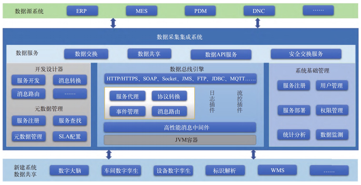通过平台上行API接口与异构数据池交互各系统数据,数据通过汇聚、处理后再共享给产线MES,集成并驱动产线管控系统、在线检测系统、AGV调度系统、机器人调度系统、预装预调控制系统、中央库管理系统及机床健康管理等系统。