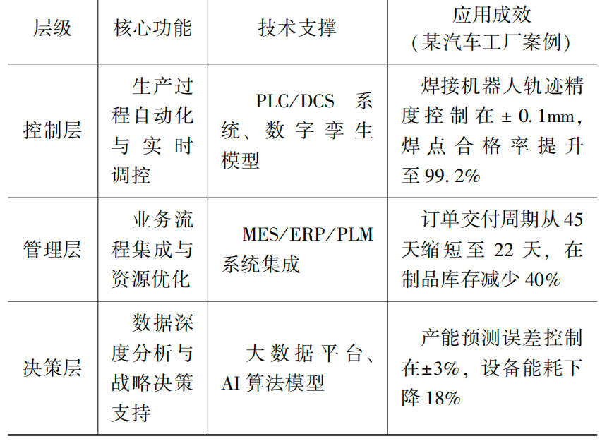 数字化工厂的技术架构呈金字塔式分层设计,各层功能与典型应用见表1。