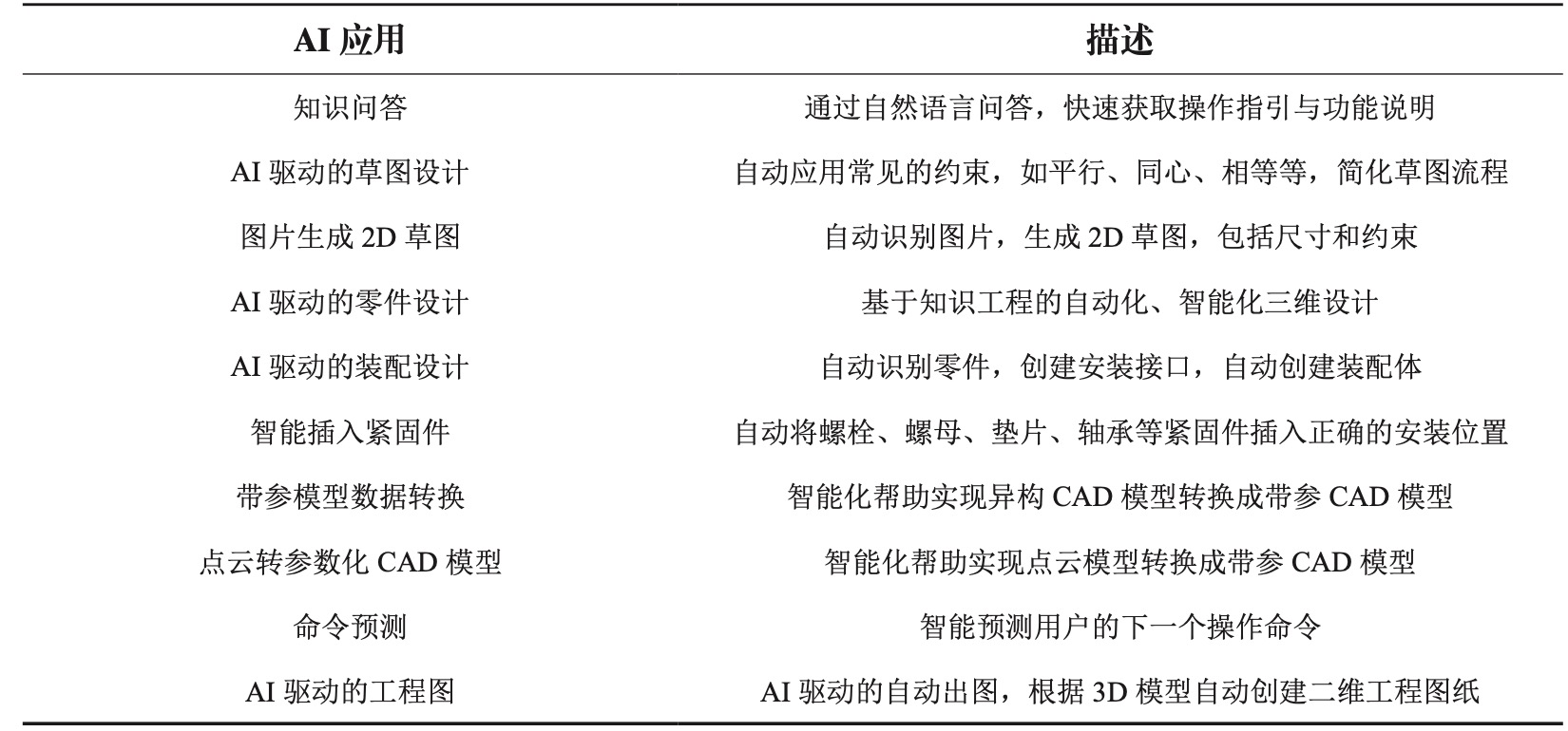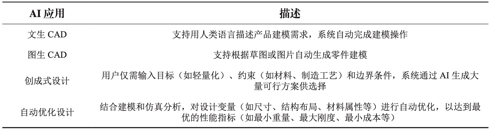 AI-Native CAD应用包括文生CAD、图生CAD、创成式设计、自动优化设计等,并且未来可能会出现更多的应用形式,具体描述见表2。