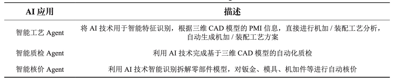 面向更多业务场景,可以开发出各种基于CAD模型的AI智能体,例如基于模型的智能工艺Agent、基于模型的智能质检Agent、基于模型的智能核价Agent等,具体描述见表3。