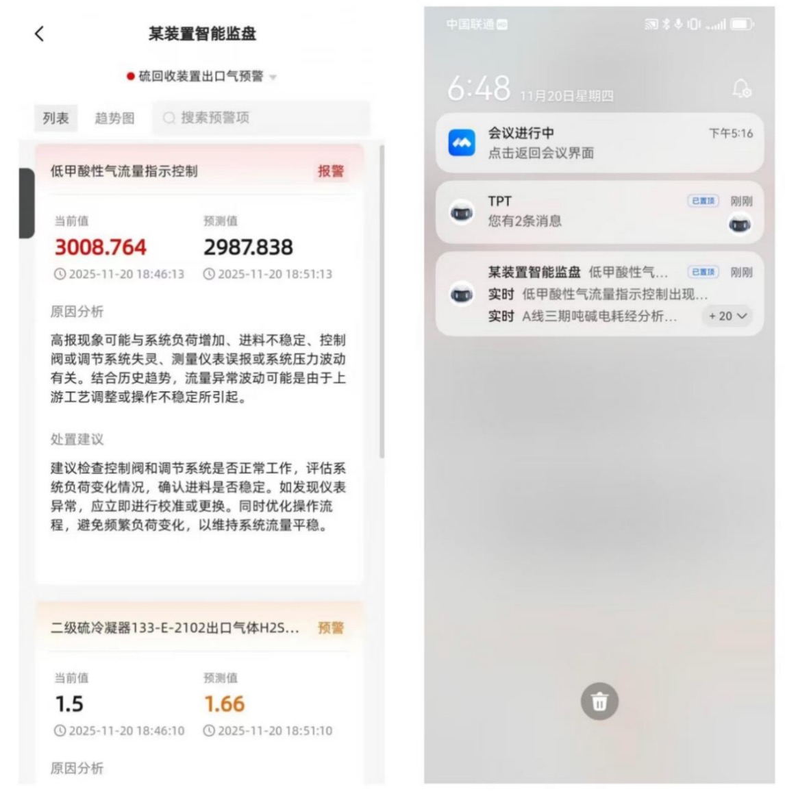 最让人安心的是“7x24小时智能监盘”功能。TPT生成的智能体就像个不知疲倦的“数字员工”,接入现场实时数据后,会持续监控工艺和设备状态,用可视化图表呈现生产动态。一旦发现潜在风险,手机消息栏会立刻推送预警,还附带异常处置方法和优化策略。以前深夜值守,工程师得盯着屏幕不敢眨眼,现在就算在家休息,也能实时掌握工厂情况,真正实现“掌观全局,决策千里”。