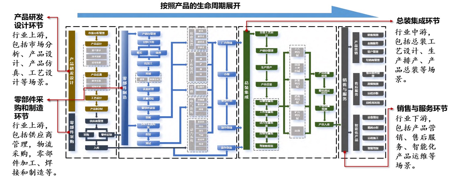 产品全生命周期视角:从原材料形态到交付形态的全过程出发,分析不同环节企业在产品生产制造过程中扮演的角色和所起的作用。具体可以根据上、中、下游企业的分工协作情况,对关键环节进行划分,以标记场景在整个产品生命周期中所处的位置。