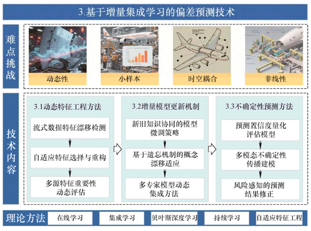 针对航空装配过程中偏差所具有的动态演化、样本稀缺及时空耦合等复杂特性,本节构建一种基于增量集成学习的偏差预测方法。该方法融合在线学习机制与自适应特征工程,形成“动态特征建模-增量知识融合-不确定性校准”的递进式技术框架,旨在有效捕捉装配过程的时序依赖与概念漂移,克服传统预测模型在动态工况下的退化问题,实现偏差的精准在线预测与风险感知决策,整体架构如图6所示。