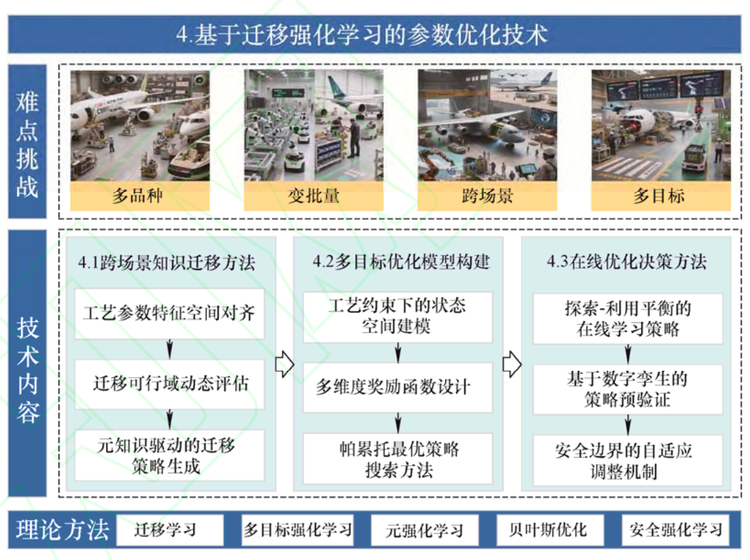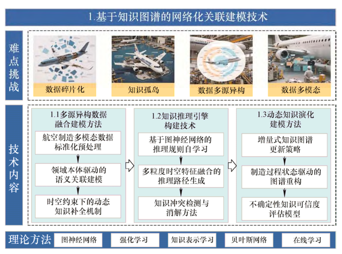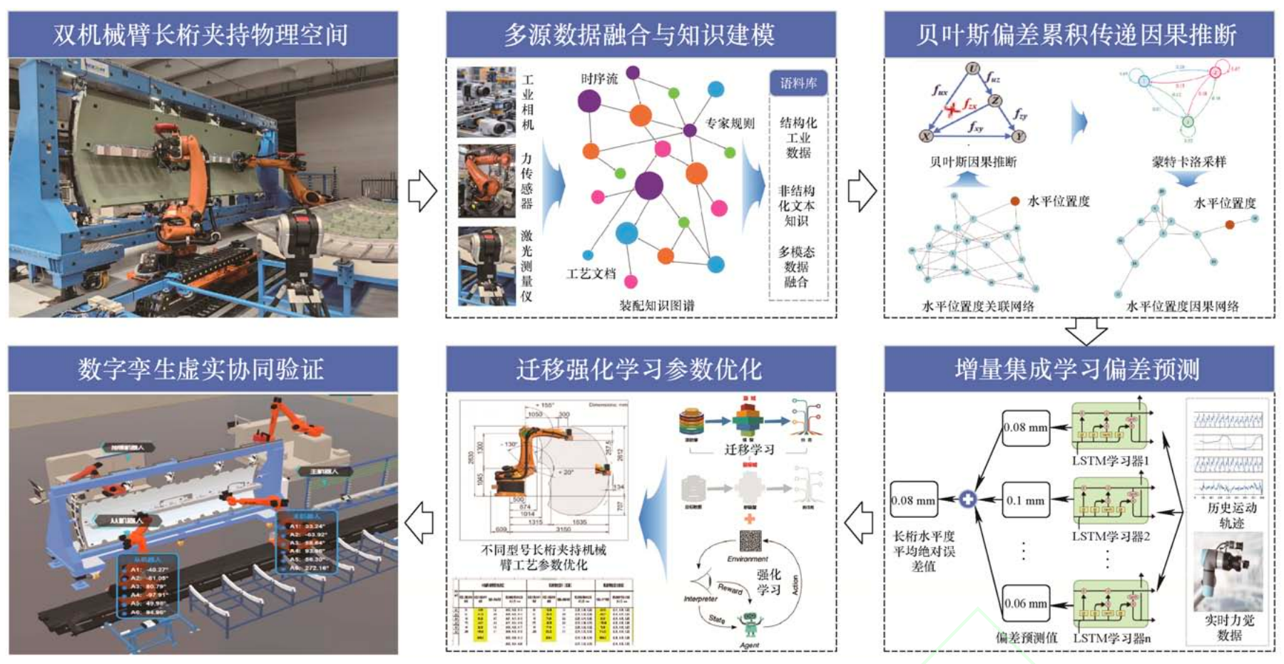 当前研究主要聚焦于单一技术维度的突破:①在数据融合方面,基于深度学习的多模态数据处理技术虽能实现特征提取,却难以建立工艺机理与数据特征的显式关联;②在偏差控制领域,传统统计过程控制方法虽可识别异常波动,但面对航空装配中多层级耦合的偏差传递问题缺乏因果推理能力;③在工艺优化层面,基于静态模型的参数寻优算法常因场景迁移导致性能衰退,难以适应飞机多型号变体混线生产需求;④在数字孪生仿真验证方面,现有数字孪生系统多侧重物理实体到虚拟空间的单向映射,缺乏“感知-认知-决策”的闭环进化机制,导致工艺优化存在显著的时间滞后性。