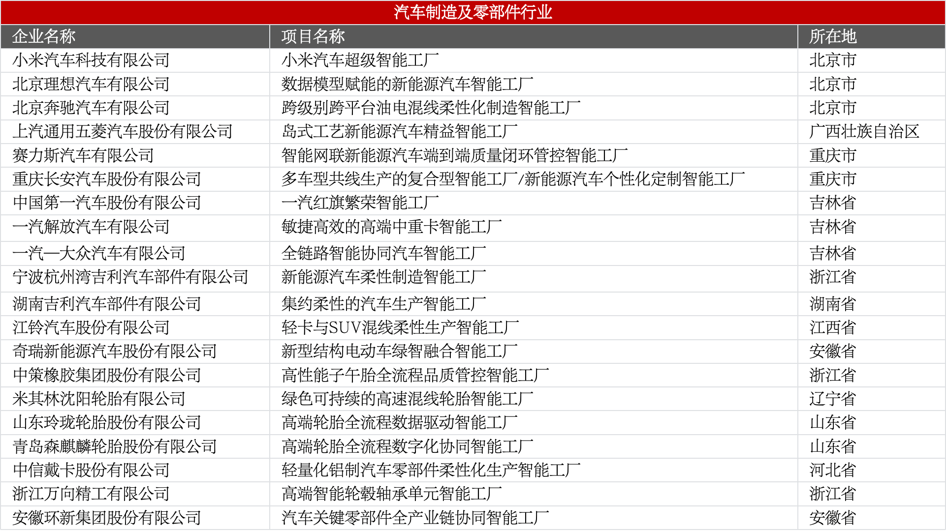 涵盖整车制造、新能源汽车、汽车零部件(车身、底盘、轮胎、轴承、铸件等)相关智能工厂,是智能工厂布局最密集的行业之一。