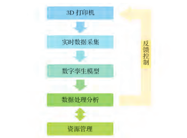 基于AI 数字孪生技术构建的闭环反馈控制系统实现了“设计-仿真-制造”全流程的智能决策。建立统一的系统框架,实现虚实环境间的实时交互,为智能生产提供技术支撑。生产过程综合运用实时反馈、流程建模仿真、自适应调整与资源优化调度,实现了对制造环节的动态管理与精准调控。该技术整合不仅有效控制生产成本,降低物料损耗,也显著提升工艺适应性与加工精度。依托物联网技术,3D 打印设备的运行状态参数被实时采集并同步映射至数字孪生平台。系统在虚拟环境中对制造流程进行多维度模拟与参数调优,进而生成工艺修正指令回传至打印设备,实现在线自适应调整。资源调度单元通过智能算法统筹分配材料与能源,构建覆盖全流程的资源优化配置体系,保障制造系统的高效稳定运行。