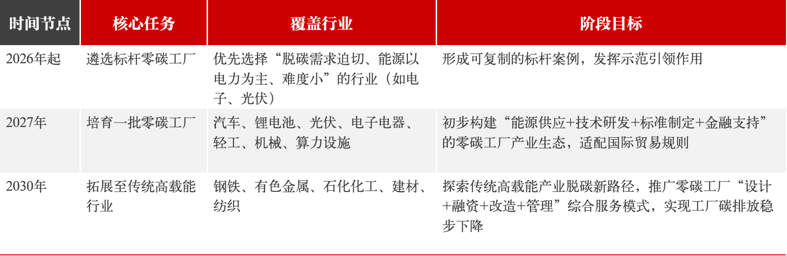 《意见》采用“先易后难、梯度拓展”的思路,分三个阶段明确零碳工厂建设的行业范围与生态目标,避免盲目推进导致的资源浪费或产业冲击。
