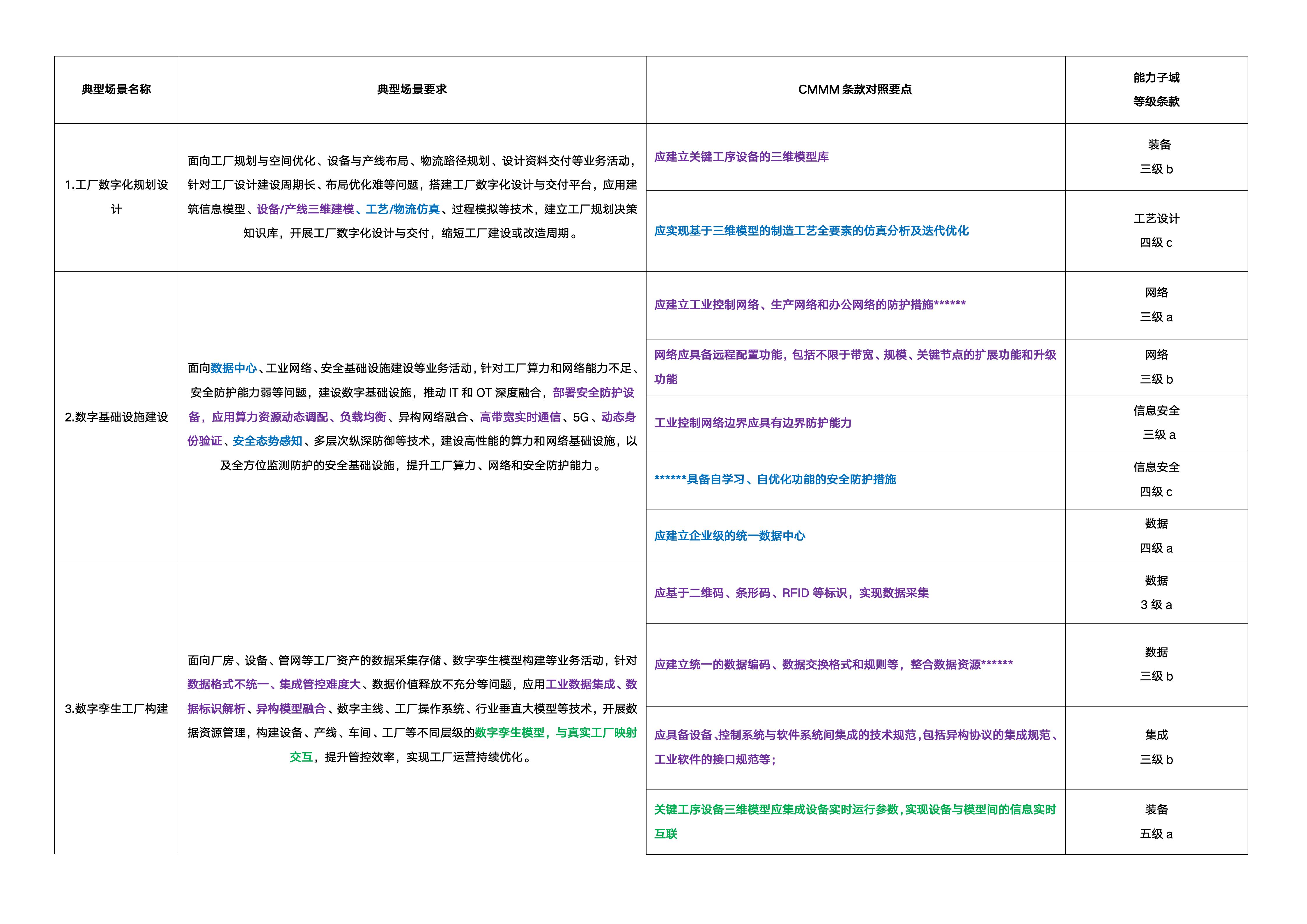 为助力企业更好地推进智能工厂建设及申报工作,相关内容梳理了典型场景中卓越级乃至领航级智能工厂需重点体现的建设要素,并与 CMMM 条款进行对照。这一对照具有重要意义: