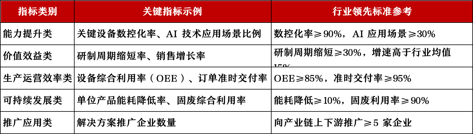 先进级智能工厂的建设成效需通过量化指标进行评估,核心指标涵盖五大维度: