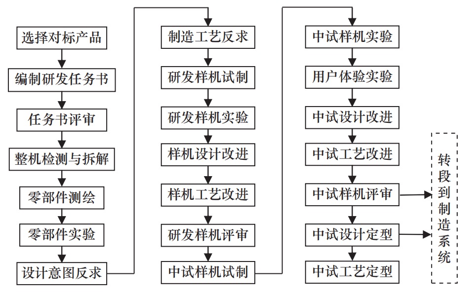 选择对标产品→编制研发任务书→任务书评审→整机检测与拆解→零部件测绘→零部件实验→设计意图反求→制造工艺反求→研发样机试制→研发样机实验→样机设计改进→样机工艺改进→研发样机评审→中试样机试制→中试样机实验→用户体验实验→中试设计改进→中试工艺改进→中试样机评审→中试设计定型→中试工艺定型→转段到制造系统