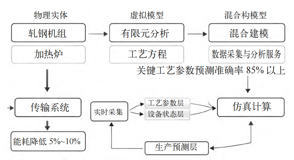 数字孪生系统由物理实体、虚拟模型、数据采集与分析服务4 部分组成,如图1 所示,可通过物理建模、数据驱动建模或混合建模方法构建虚拟孪生。结合大数据分析与机器学习方法,如随机森林与支持向量机,可对关键工艺参数进行预测与优化,准确率可达85% 以上。研究方法框架涵盖数据采集-模型构建-优化策略设计-验证反馈四环节,实现生产过程动态仿真、异常识别与闭环优化,理论上可降低能耗5% ~10%,提升产品合格率,为轧钢厂智能化管理提供系统性理论支撑。