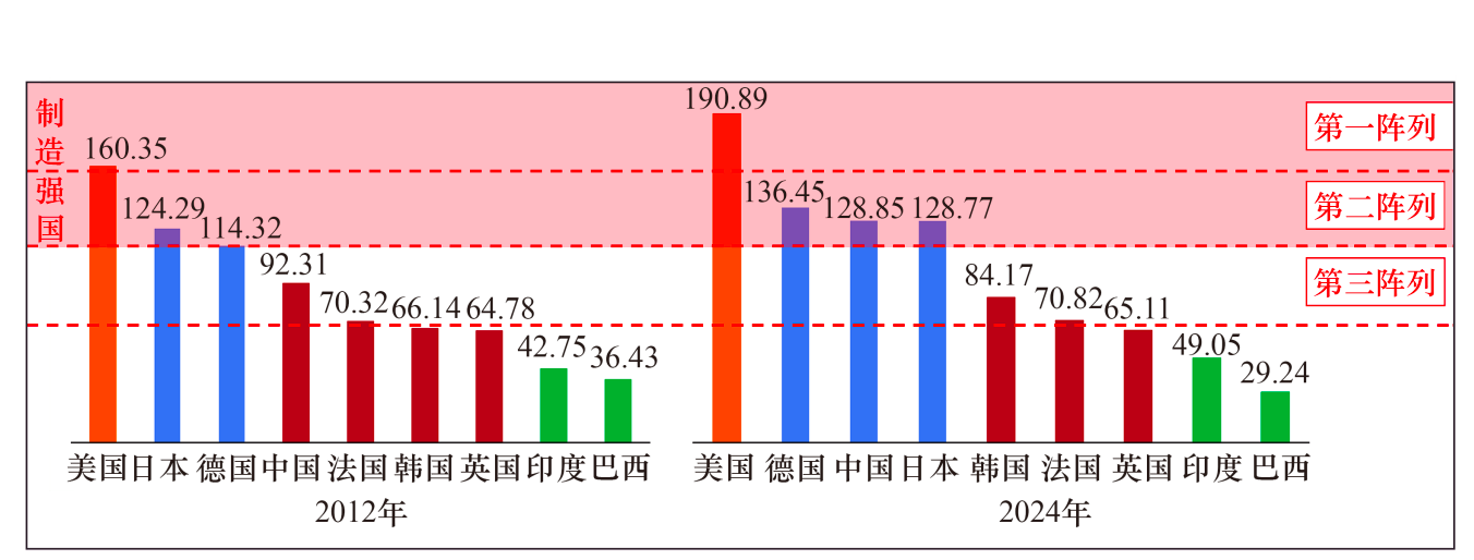 本文通过构建制造强国评价指标体系,选取了9个世界主要制造国家并划分为3个阵列,评价其在2012—2024年制造业发展情况。
