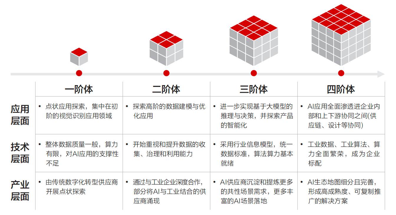 • 应用层面,一阶体聚焦应用探索,开展视觉识别等点状应用;二阶体则开始探索高阶的数据建模与流程优化应用,实现了串点连线和流程智能化;三阶体进一步实现基于大模型的推理与决策,并推动更大范围单元、产品、系统的智能化;四阶体中AI应用全面渗透进企业内部和上下游之间,例如供应链、设计等协同,实现跨系统的智能融合,乃至平台化应用,实现了行业整体的智能化。