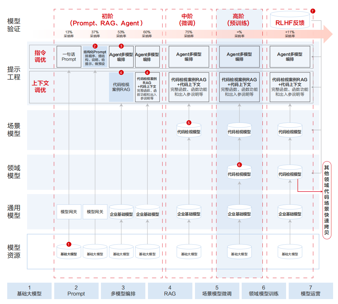 模型验证结果显示了明显的性能提升轨迹:初阶方案从13%采纳率开始,在通过Prompt、RAG、Agent优化后,达到60%;中阶方案采用微调,将采纳率大幅提升至75%;高阶方案采用预训练,在经过RLHF后还可提高采纳率11%。这一案例展现了AI技术递进带来的效果改善,企业可以根据自身能力选择合适起点,渐进式提升AI应用效果。