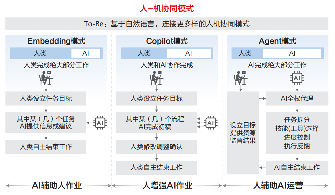 这种转变呈现出从AI辅助到AI主导的渐进式演进特征。Embedding模式中,人类完成绝大部分工作,AI主要提供信息或建议支持;Copilot模式实现了人与AI的深度协作,人类主导工作目标、分工和结果确认,AI协助在部分流程环节“完成初稿”;Agent模式则代表更高级的协同阶段,AI承担绝大部分工作,人类主要负责目标设定、资源提供和结果监督。正如Ethan Mollick在《Co-Intelligence》一书所述,“AI as a coworker,AI as a tutor,AI as a coach, AI as our future.”。