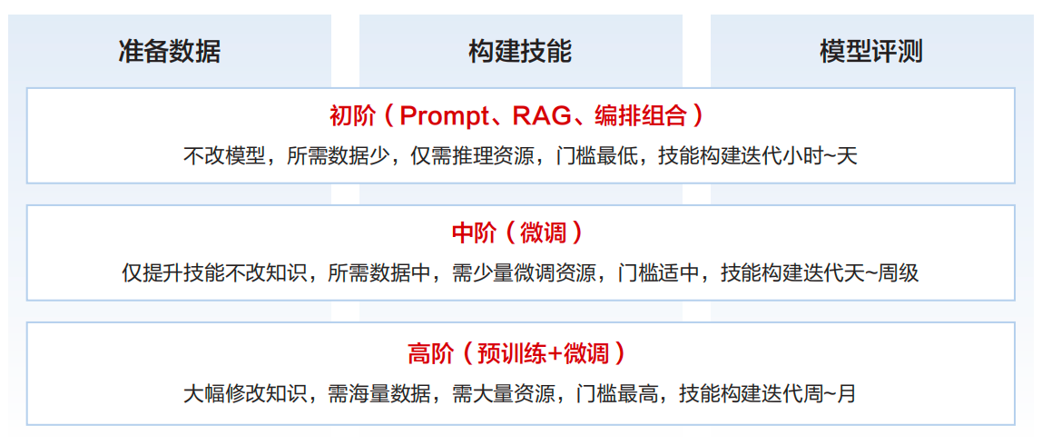 初阶方案不改模型,所需数据少,仅需推理资源,门槛最低,构建周期从数小时到一天不等;中阶方案基于微调技术,仅提升技能不改知识,数据需求适中但质量要求高,门槛适中,构建周期从数天到周级不等;高阶方案采用预训练+微调模式,需要海量数据和大量资源,门槛最高,构建周期数周到月级不等。企业需要根据场景对精度的不同诉求、自身技术基础、资源投入能力和业务紧迫性选择合适的交付方案。