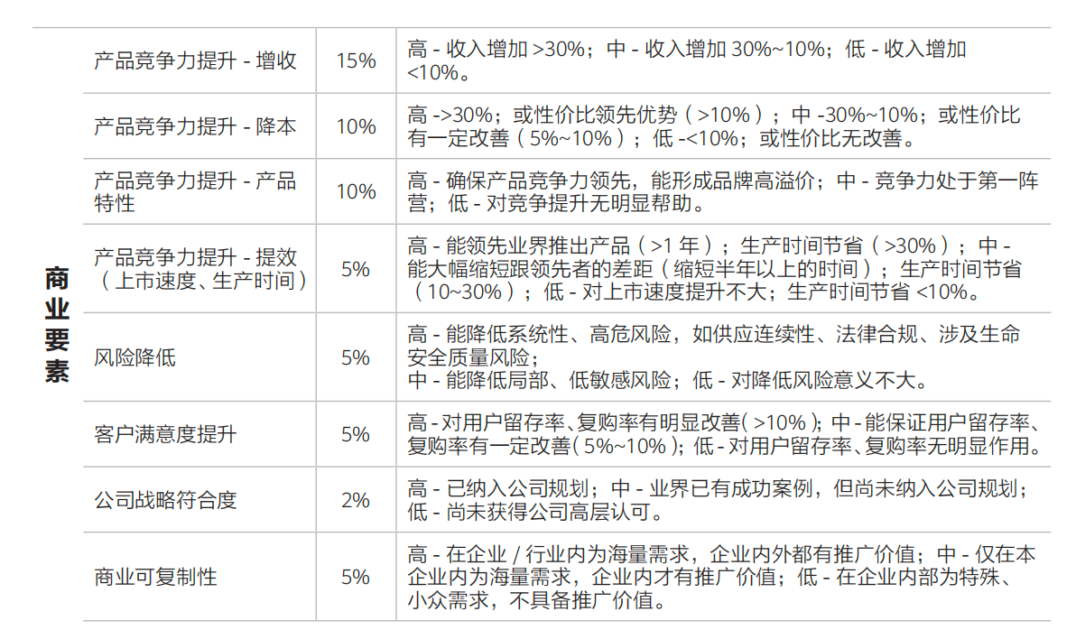 •在技术要素中,技术可行性是首要考量,重点关注业界是否已有可借鉴的成功案例,能够拿来即用,少走弯路;其次是数据准备度,即是否具备充足且高质量的数据支撑,若数据条件不足,则还需开展大量数据治理工作;
