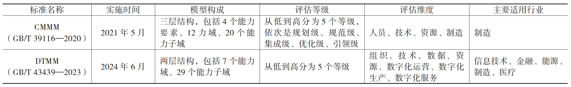 截至2025 年8 月,通过DTMM 完成自评估的企业共有2 250 家,覆盖62 个行业,其中二级及以上企业占比达34%。作为成熟度评估领域的另一重要国家标准,DTMM 较CMMM 起步晚,在应用深度和行业覆盖度上略显不足,但其通用化的模型设计具有更广泛的应用潜力。两项国家标准在模型构成、评估维度和适用行业等方面存在显著差异,详细对比如表2。