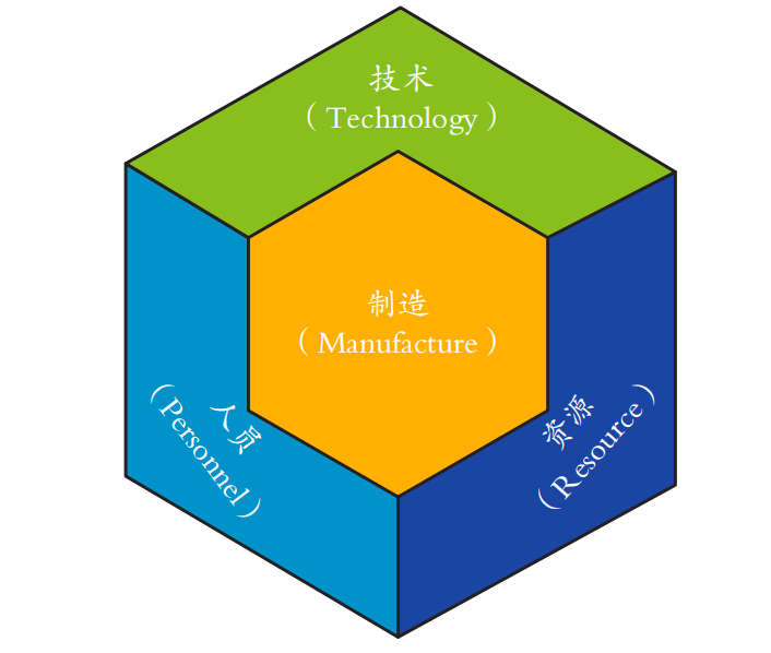 在国内成熟度评估领域,CMMM 是当前影响力最深远、应用实践最成熟的评估标准。自2021 年作为国家标准正式发布实施以来,该模型已在全国范围内得到广泛推广与应用。其模型设计遵循《国家智能制造标准体系建设指南(2015 版)》 中对智能制造系统架构的定义,从生命周期、系统层级、智能特征三个维度构建评价体系,核心是阐释“智能”能力如何赋能“制造”过程,为企业评估自身智能制造综合水平、识别改进方向提供了权威的评估模型框架。具体而言,CMMM 模型包含人员 (Personnel)、技术(Technology)、资源(Resource)及制造(Manufacture)4 个能力要素,即“PTRM” 能力要素(见图1)。能力要素是企业实施智能制造的必备条件,其中人员、资源、技术为支撑要素,制造为核心要素,体现了人员借助资源和技术持续改善制造过程的特点。