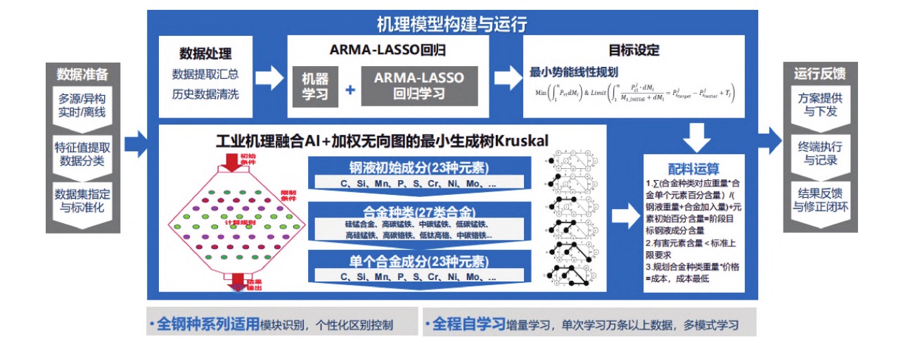 合金智能投料加料模型是公司自主研发的核心项目(图8),模型将钢中23个元素含量与料仓中27类合金成分及价格作为输入条件,运用多元线性回归、加权无向图和最小生成树克鲁斯卡尔(Kruskal)算法,在特定钢种框架内计算最优合金配料方案,以实现成分目标和成本最小化。最终通过合金模型优化合金料配比,在5s内一键完成配料自动加料,实现降低合金成本21.84%。