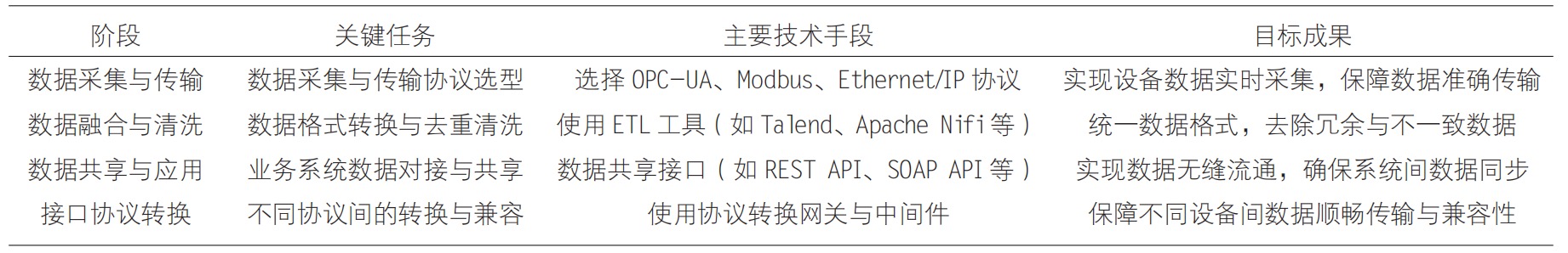 建设数据集成平台的首要任务是确保各类业务系统与设备实时且高效地开展数据交换活动。平台搭建流程可分为 3个阶段:数据采集与传输、数据融合与清洗、数据共享与应用。