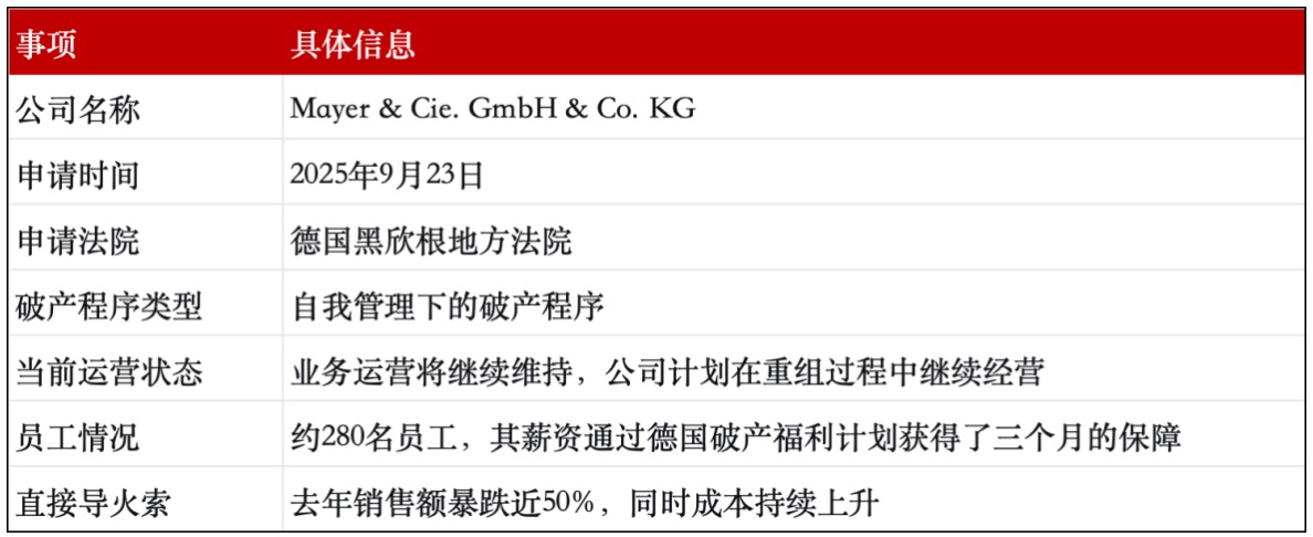 位于德国阿尔布施塔特的迈耶西(Mayer & Cie.)公司门前,依旧整洁有序,却少了往日的繁忙。这家拥有120年历史、掌握300多项专利的针织机械工程巨头,在9月23日向当地法院提交了自我管理下的破产申请。