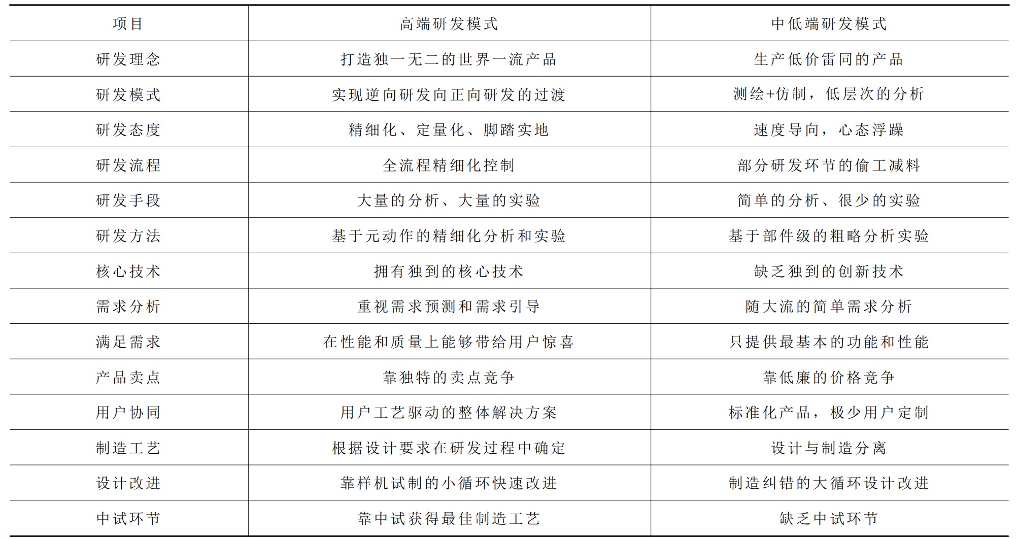 与中低端产品的研发(测绘式、分析式、改进式)相比,为了保障高端产品的功能、性能和质量,高端产品的研发必须具有自己独到的特点,这两种研发模式的对比见表 1。