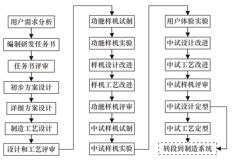 用户需求分析→编制研发任务书→任务书评审→初步方案设计→详细方案设计→制造工艺设计→设计和工艺评审→功能样机试制→功能样机实验→样机设计改进→样机工艺改进→功能样机评审→中试样机试制→中试样机实验→用户体验实验→中试设计改进→中试工艺改进→中试样机评审→中试设计定型→中试工艺定型→转段到制造系统