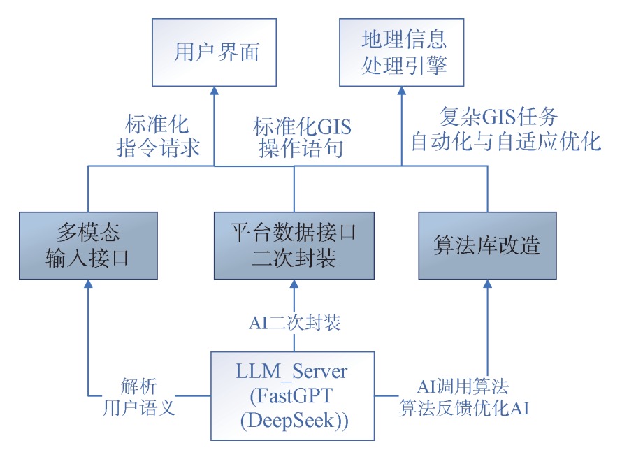 该架构主要包含三部分:①设计支持文本与语音的多模态输入接口,可将用户语义实时解析为标准指令,形成协同处理入口;②对GIS数据接口进行AI二次封装,利用DeepSeek的语义解析与知识库推理能力,将自然语言指令自动转化为可执行的空间数据操作,实现从任务需求到功能执行的无缝衔接;③改造GIS专业算法库,构建“AI调用算法-算法反馈优化AI”的双迭代闭环,依据用户需求智能匹配算法,并根据运行结果动态调整参数,实现复杂任务的自适应优化。