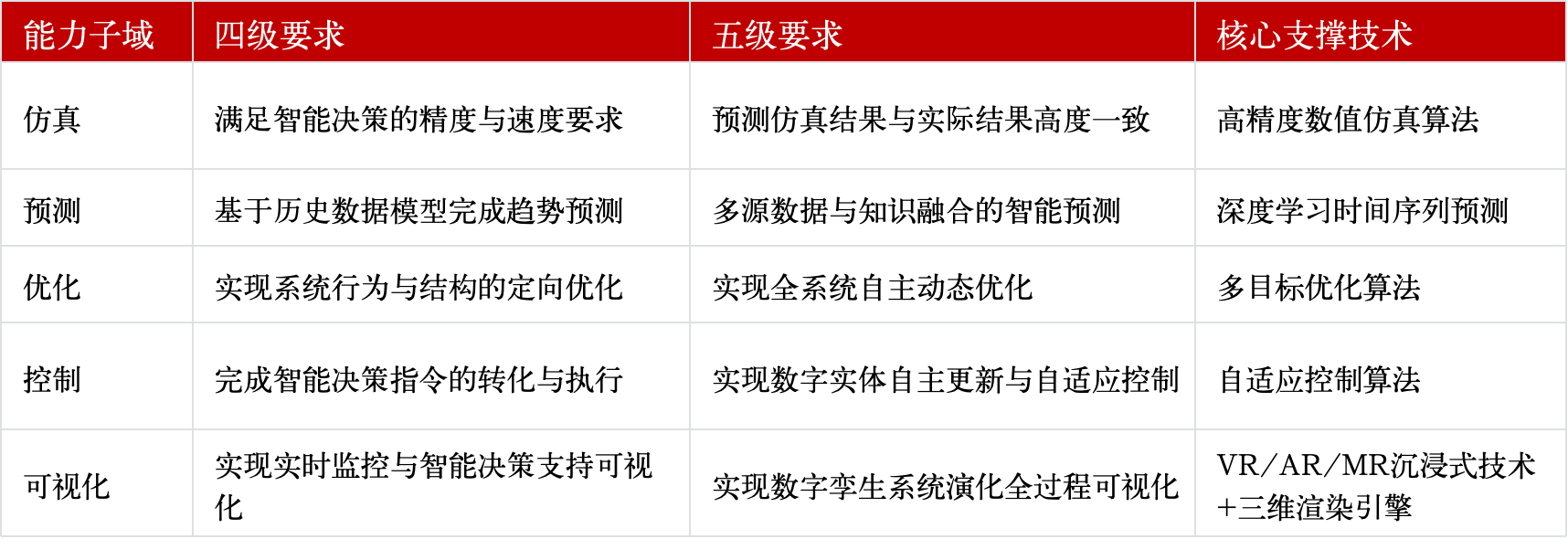 核心能力要求:实现数字实体数据自主获取与全系统自主优化,模型具备自主学习衍生能力;数字模型形成几何/物理/行为/规则全模型并能自主优化参数,孪生数据实现智能融合与自主获取,应用能力域实现全系统智能预测与自主动态优化。
