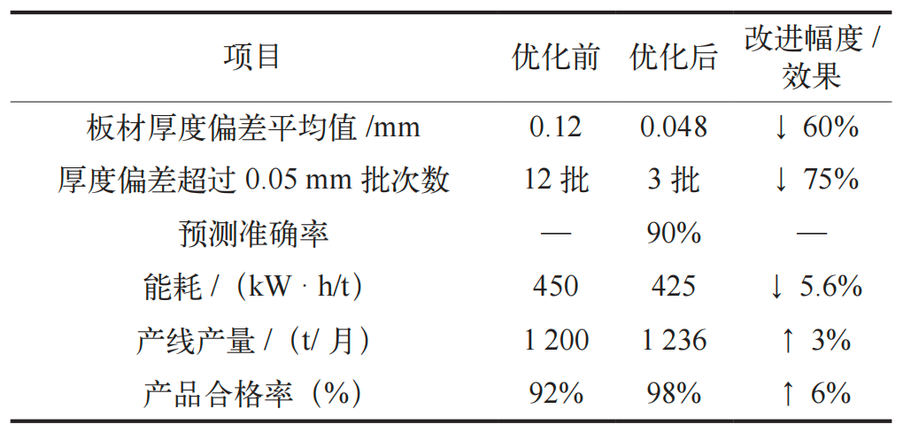 在策略框架中,历史批次数据与实时传感器数据融合是核心。通过多变量分析和机器学习预测,可提前预警设备异常或厚度偏差。以2023年5月一批热轧卷为例,闭环优化策略提前预测厚度偏差超过0.05 mm 的批次5 个,实现生产效率提升3%,验证了数据驱动优化在实际生产中的可行性和有效性。