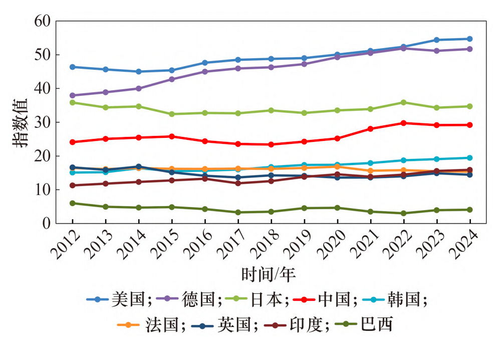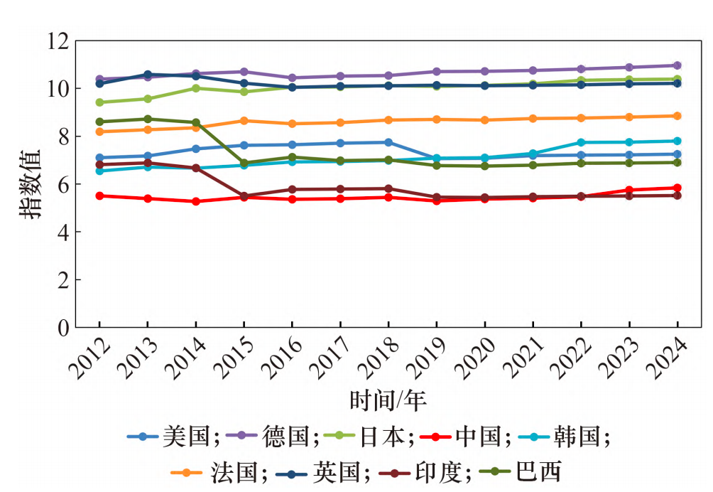 2012-2024年,印度制造强国发展指数由42.75提升至49.05,上涨6.3;巴西制造强国发展指数由36.43下降至29.24,下跌7.19,降幅居九国之首,两国整体发展差异性较为显著。