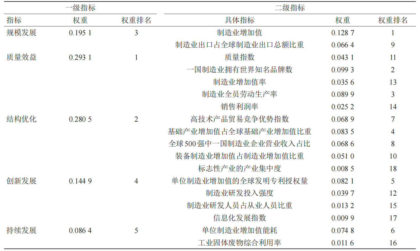 从2013年建立制造强国评价指标体系以来,在开展制造强国评价研究过程中,科学优化统计口径、计算方式、指标归类、根数据权重等,持续完善相关指标设定,最终形成如表2所示的制造强国评价指标体系。