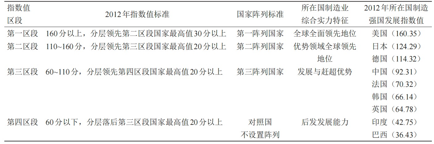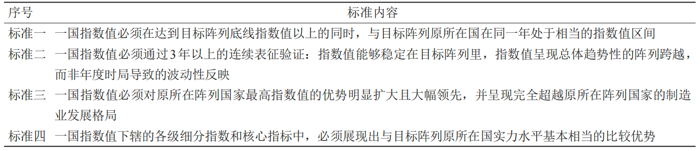 此外,在制造强国发展指标体系构建时,充分考虑到,随着九国制造强国进程与国际制造业竞争态势的发展,以2012年九国制造强国发展指数值为基准初设的区段与阵列间的指数值差距与所在国均会出现变化。因此,为科学准确运用该指标体系表征的九国制造强国进程,并不仅仅拘泥于各区段与阵列间的2012年初设指数值分差,而是将一国实现制造强国进程水平阵列跨越,细分为必须同时达到的4个标准(见表4)。