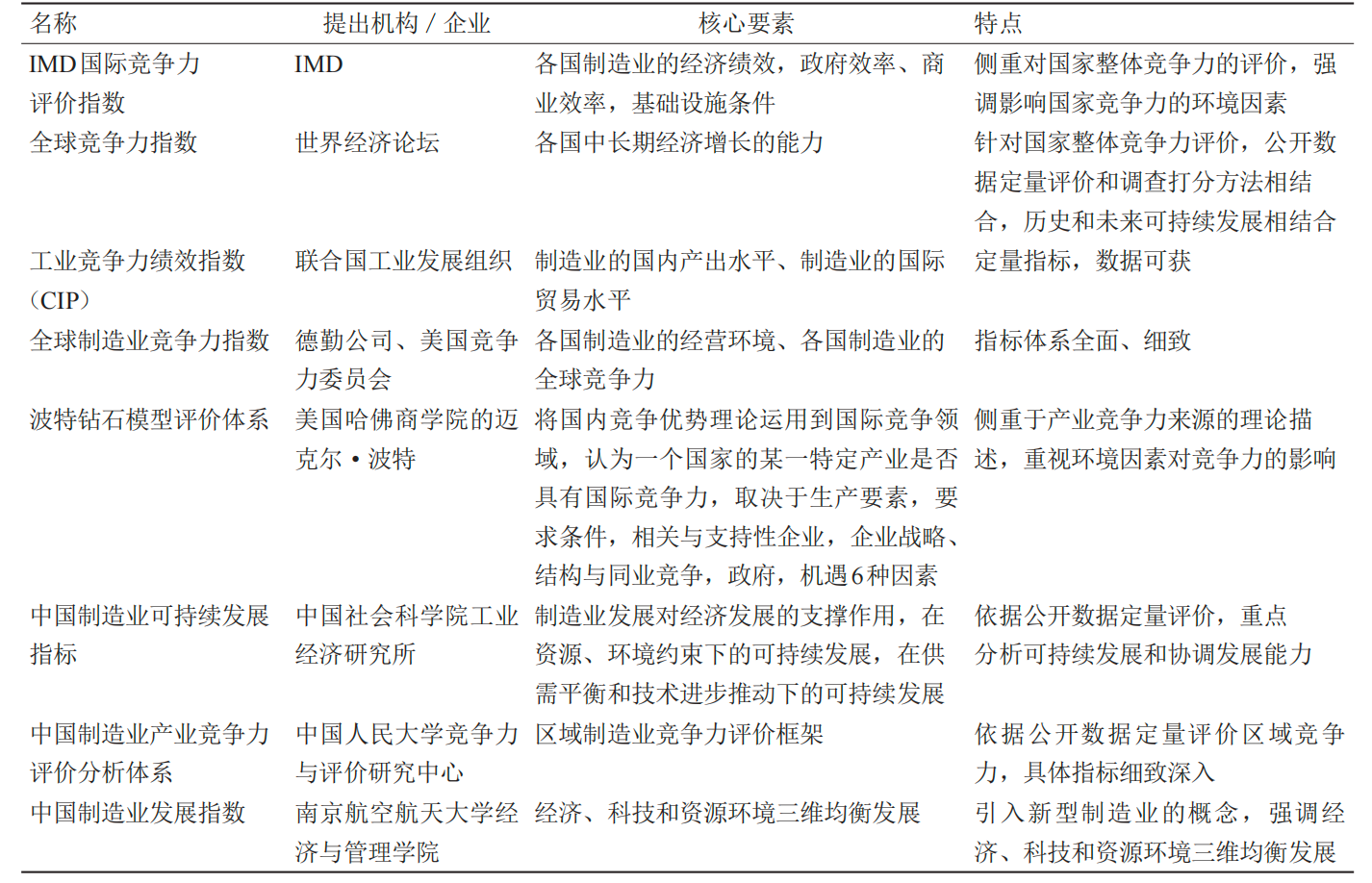 关于制造强国评价的研究,目前尚未形成统一的全球标准。综合来看,国内外研究在评价的出发点和侧重点方面存在显著差异,形成了两条主要研究脉络:一是国际研究,侧重战略竞争与相对优势评估;二是国内研究,侧重多维度综合评价与动态演进。国内外主要机构发布的制造业评价指标体系及特点如表1所示,可为我国制造强国评价指标体系构建提供借鉴。