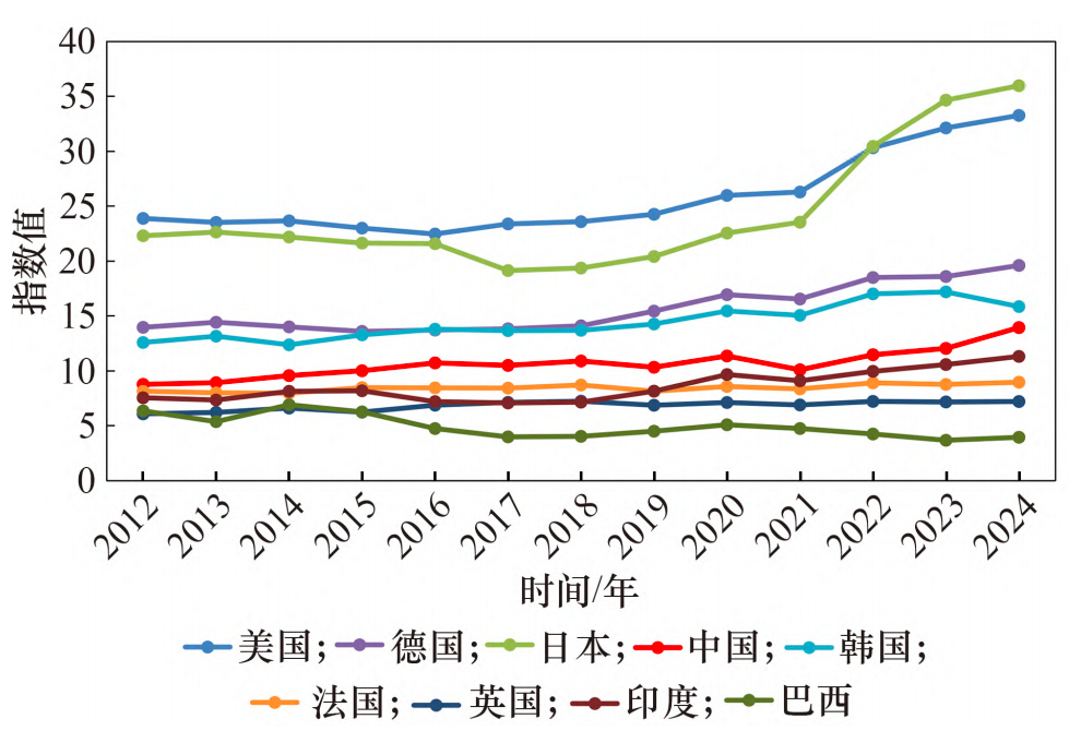 日本制造强国发展指数从2012年的124.29上升至128.77,上涨4.48。虽因日元贬值、通货膨胀等问题在“规模发展”“质量效益”“结构优化”方面的分项数值有所下降,但“创新发展”分项数值提升幅度超过其他8个国家。其关键缘由在于,与日本发展实际高度适配的国家创新体系架构对该国科技创新的演进与突破发挥了不可替代的驱动作用,而此体系所具备的高水平整体创新效能,正是日本能够成为东亚关键“创新极”的核心支撑。