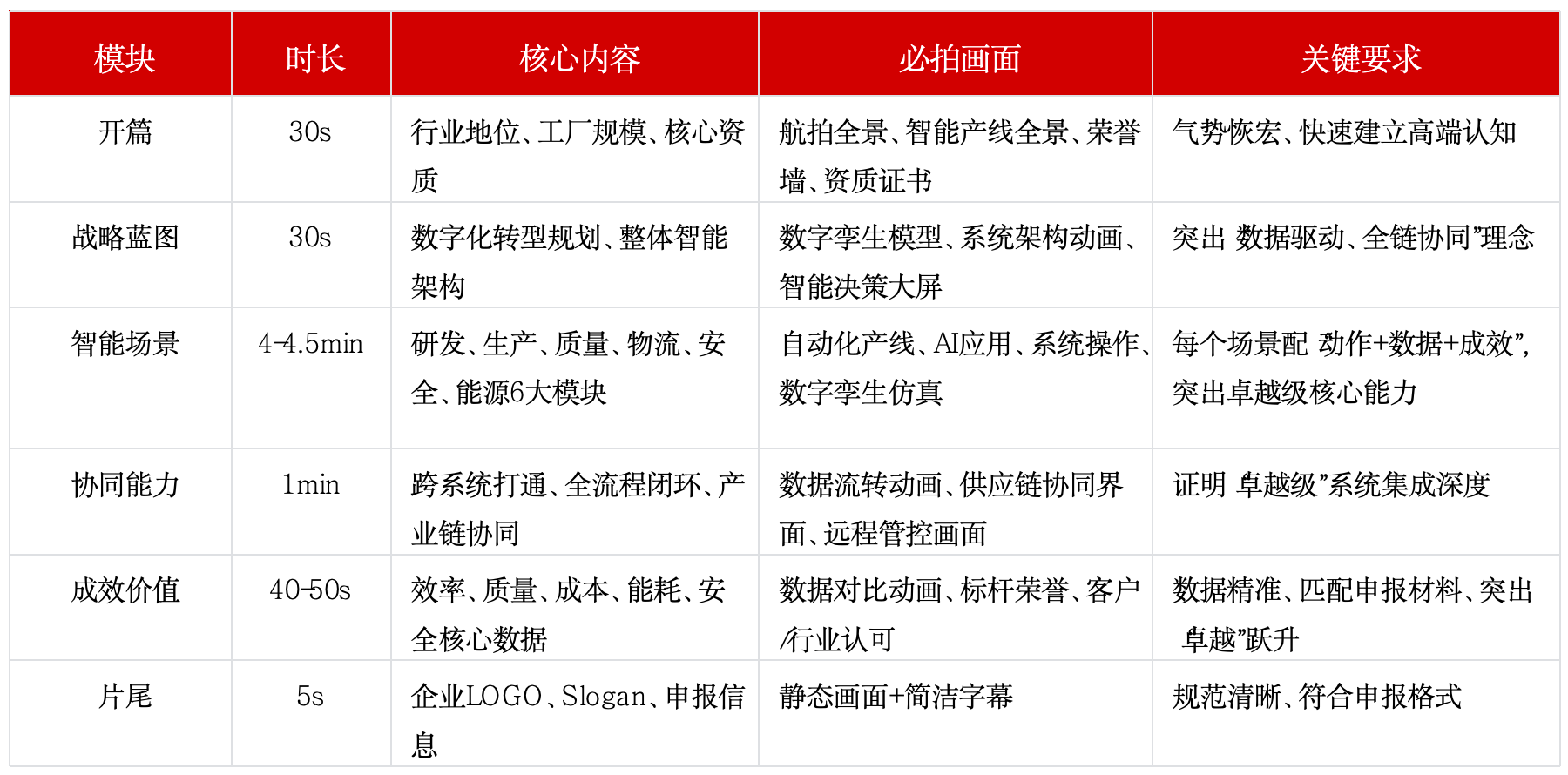 结合上述案例,提炼出卓越级智能工厂申报视频的通用标准框架,明确各模块时长、核心内容、必拍画面及关键要求,企业可结合自身行业特性调整,确保不偏离申报核心。