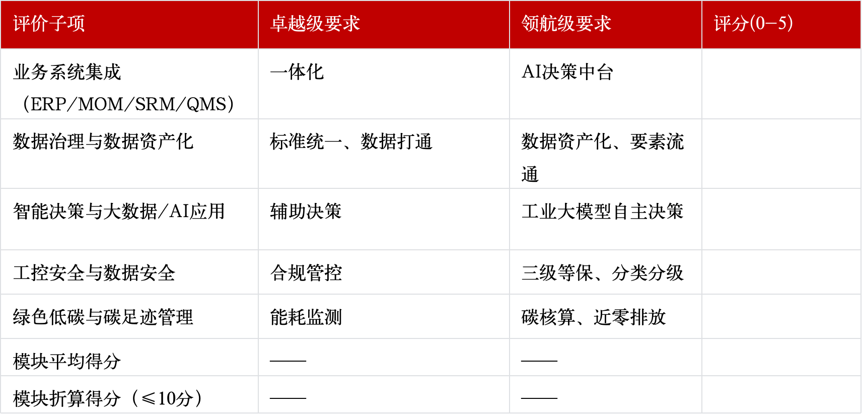 评分规则:0–5分制(0=未开展,1=初始,2=规范,3=集成,4=优化,5=引领)
