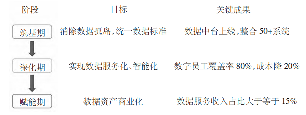 按上述方法,公司组建专项工作组,通过“自上而下”与“自下而上”相结合的调研方式,首先对战略决策层开展深度访谈,聚焦企业战略目标与数据赋能的结合点。同时深入各业务部门进行流程测试,梳理出涵盖经营、生产、供应链等各业务域的32个核心数据场景与业务流程图谱。经DCMM数据战略维度对标评估,发现存在数据战略与业务战略匹配度不足、跨部门数据协同机制缺失、数据应用价值挖掘深度不够等关键问题。针对评估结果,公司制定出分阶段推进的“三年三步走”行动路线图,如下:①筑基期(2024-2025年)。完成数据底座建设,整合核心业务系统。②深化期(2025-2026年)。实现数据服务标准化,支撑内部数据共享利用。③赋能期(2026-2027年)。输出数据能力至外部市场,形成新增长点。数据战略实施路线图示例如图2所示。