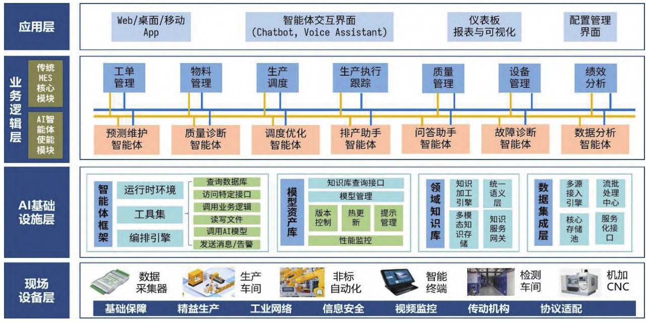 该架构能将人工智能(AI)能力内化为系统原生基础设施,推动MES 从规则驱动向智能决策转变,提升制造柔性与决策能力,为工业智能化升级提供可行方案。