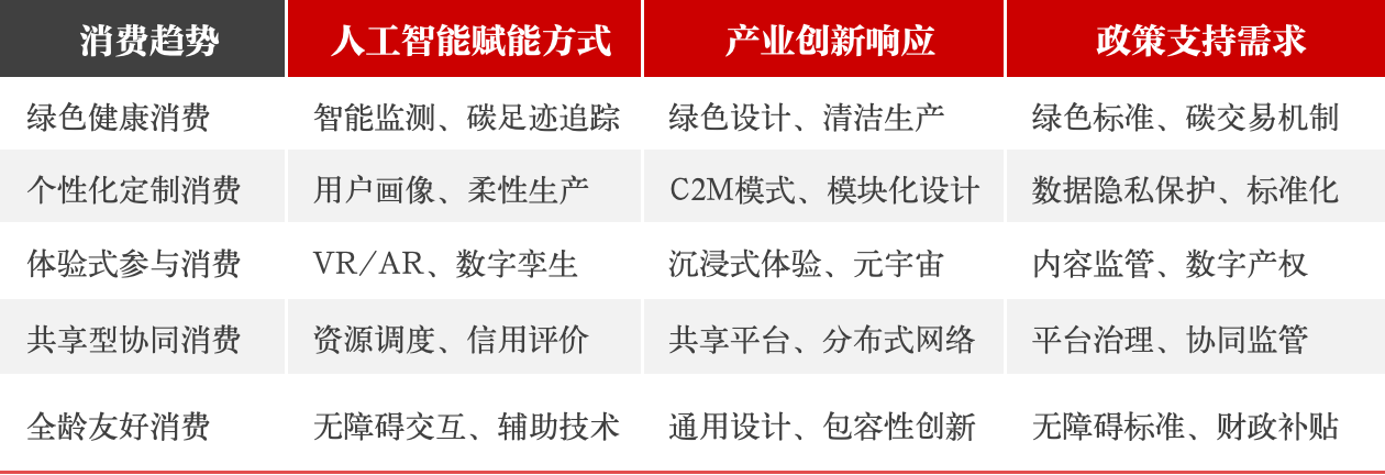 在需求端,人工智能主要通过创造新的消费需求和提升消费品质,全面释放内需潜力,进而驱动产业体系的升级。一方面,人工智能催生了智能家居、智能网联汽车、智能穿戴设备等新产品,创造了新的消费增长点;另一方面,人工智能推动了个性化定制、体验式消费、共享经济等新模式发展,满足了消费者多样化、高品质需求。这种供给与需求的良性互动,形成了“需求牵引供给、供给创造需求”的更高水平动态平衡。表2列举了一些人工智能驱动的消费创新与产业响应示例。诸如绿色健康消费、个性化定制消费、体验式参与消费、共享型协同消费、全龄友好消费这些创新型的消费概念,在人工智能技术的赋能下,能够衍生出全新的消费场景,继而带动相关产业和政策的新质创新。