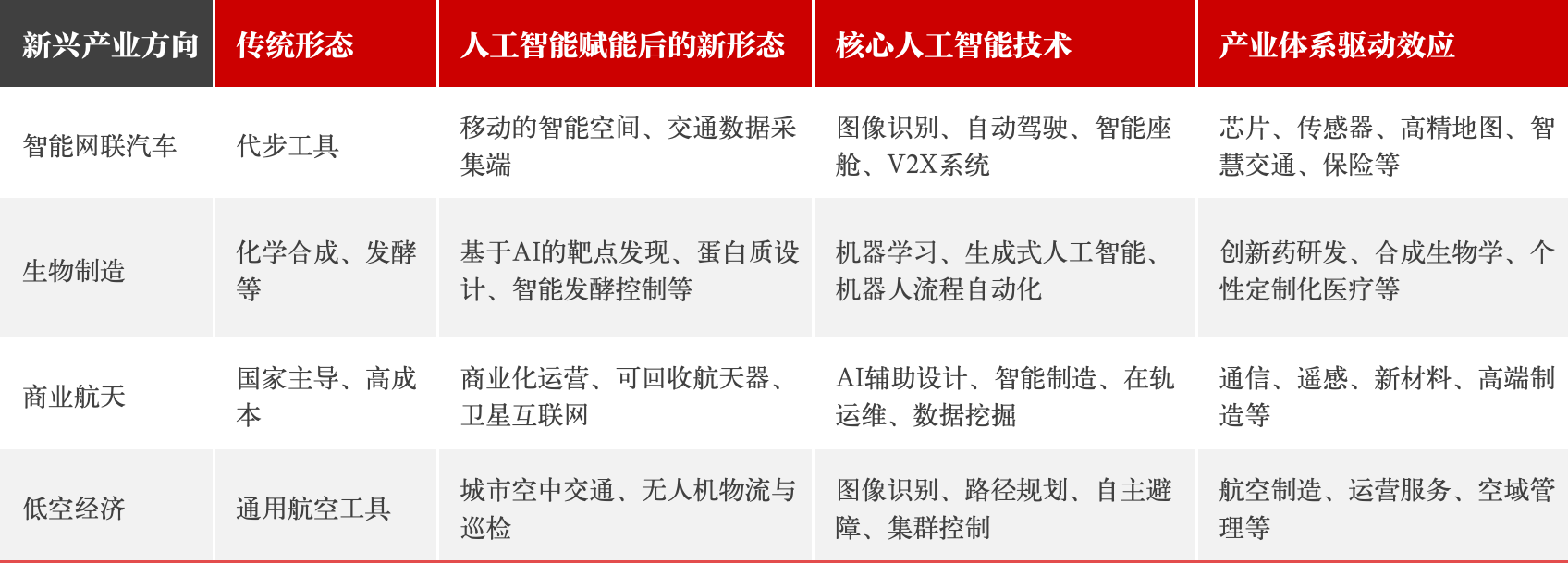 战略性新兴产业是引领国家未来发展的重要力量,也是人工智能驱动现代化产业体系的前沿阵地。据工信部数据,2024年,我国战略性新兴产业增加值占GDP比重达13%,与传统产业80%左右的占比比起来,还只是“小块头”。这表明相关产业发展仍面临诸多挑战。《建议》提出,要“构建以先进制造业为骨干的现代化产业体系”。因此,在“十五五”时期,需要进一步加大对新兴支柱产业的培育力度,重点在新一代信息技术、新能源、新材料、智能汽车、生物技术、航空航天、低空经济等新兴支柱产业取得新的突破,努力催生出数个万亿元级甚至更大规模的市场。表3对比了一些人工智能赋能的重要新兴支柱产业的基本特征。可以发现,在这些新兴支柱产业中,核心的人工智能技术对传统行业形态进行了创造性的赋能,从而驱动整体产业体系的系统构建与协同发展。