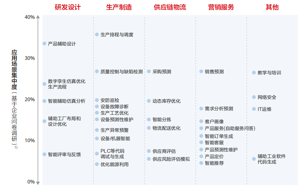 随着AI技术的不断演进,其在工业领域的应用已不再局限于单一环节,而是实现了研、产、供、销、服全链条的覆盖。就目前来说,工业企业的AI应用探索已涌现出大量共性场景,其中部分场景的应用效果尤为显著,成为工业AI落地的“标杆领域”。
