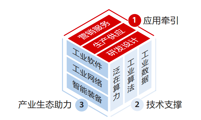 • 应用层面:工业企业基于研产供销服业务流程中的实际场景需求,以业务应用的需求为出发点,选择高价值的AI用例,产生应用效果和价值;