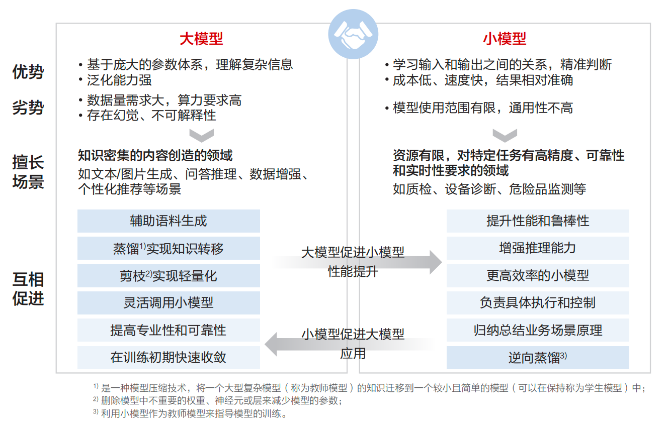 • 大模型赋能小模型,大模型通过辅助语料生成、知识蒸馏转移、模型剪枝轻量化等技术手段,有效提升小模型的专业性、训练效率和推理能力;
