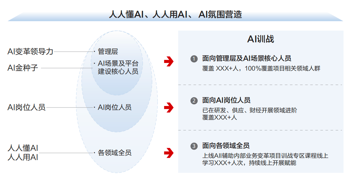 •各领域全员:上线AI辅助内部业务项目的训战专区课程,持续开展线上赋能,确保全员掌握AI应用技能,实现“人人懂AI、人人用AI”。