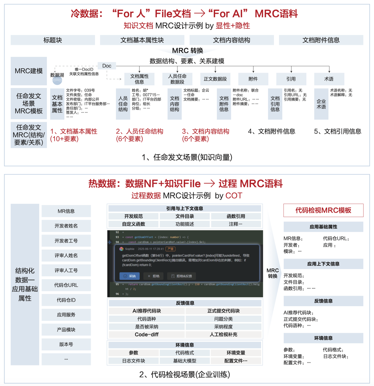 •热数据的MRC转换则聚焦于企业的实时业务过程,将数据NF知识文档转换为过程MRC语料。在代码检视场景中,可以通过COT的方式,将引用上下文信息、结构化数据、反馈信息、环境信息等要素转化成代码检视MRC模板。